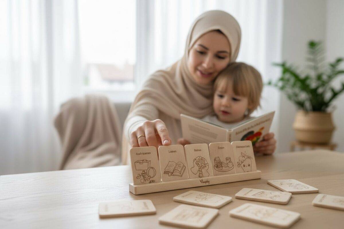 Holz-Routinekarten, die Kindern spielerisch Selbstständigkeit und islamische Werte vermitteln. Perfekt für Kindergarten- und Grundschulkinder – ohne Druck, mit viel Freude!